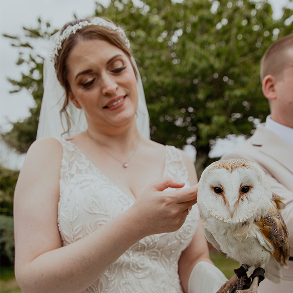 Elevate your wedding album with a touch of wonder. Our custom white gauntlets invite the bride and groom to hold majestic birds of prey, adding enchanting moments that beautifully complement your professional photographs.